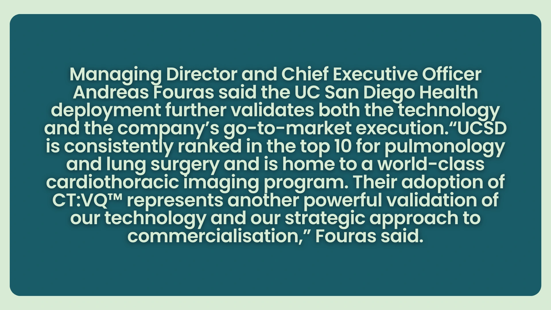 According to the ASX announcement, UC San Diego Health has begun using CT:VQ™ under a structured commercial launch framework, with introductory pricing in place through March 31, 2026. Full commercial terms will apply thereafter, allowing clinicians time to embed the technology into routine practice before transitioning to standard pricing arrangements.