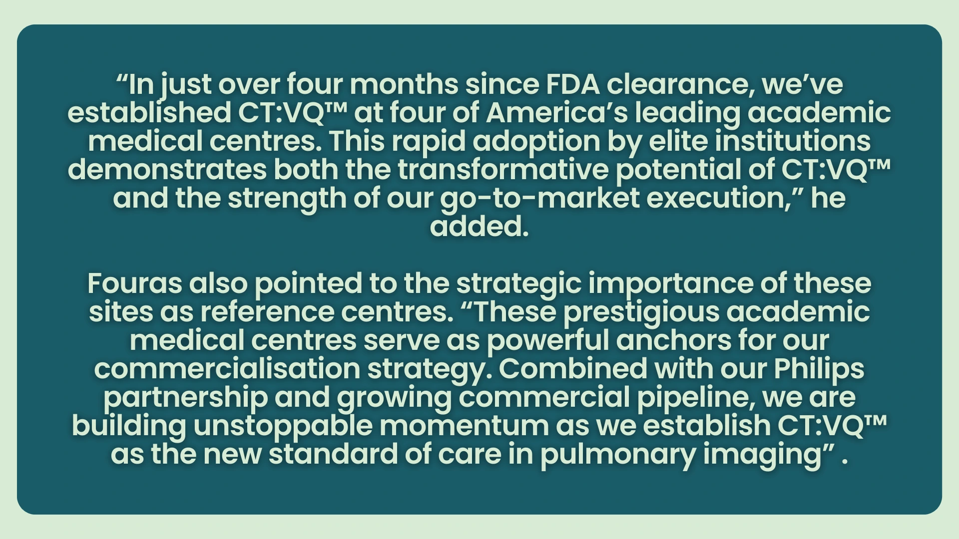Looking ahead, attention will likely turn to how quickly CT:VQ™ deployments translate into recurring commercial revenue as introductory pricing periods roll off. Additional academic medical centre wins, community hospital adoption and expansion beyond flagship sites will also be key markers of scale.