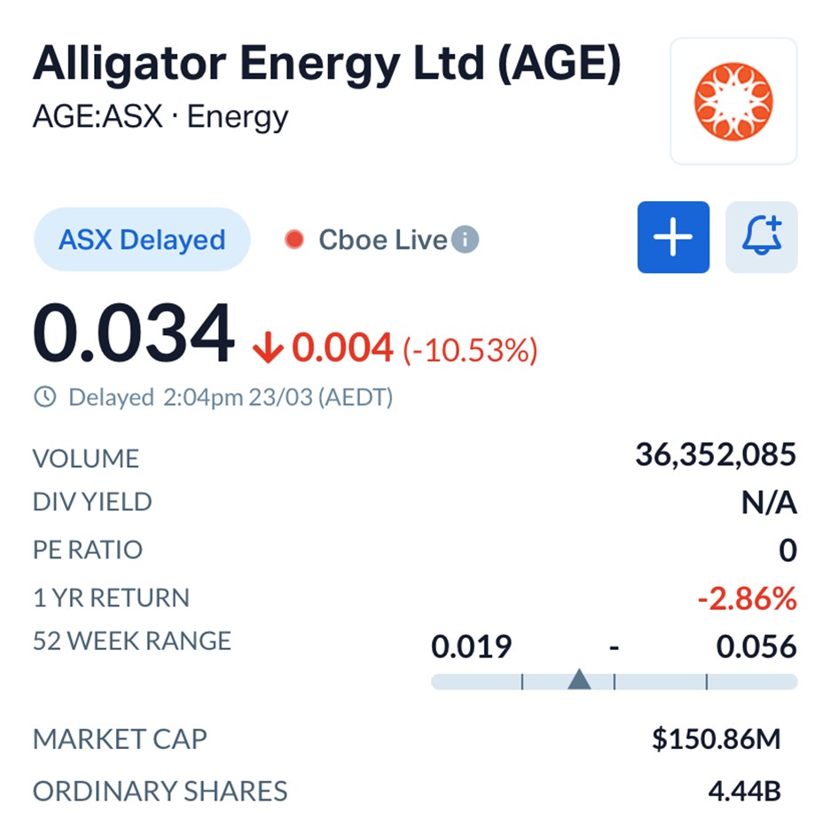 Despite the operational milestone, Alligator Energy’s shares were trading at $0.034, down 10.53% in afternoon trade, with volumes exceeding 34 million shares.