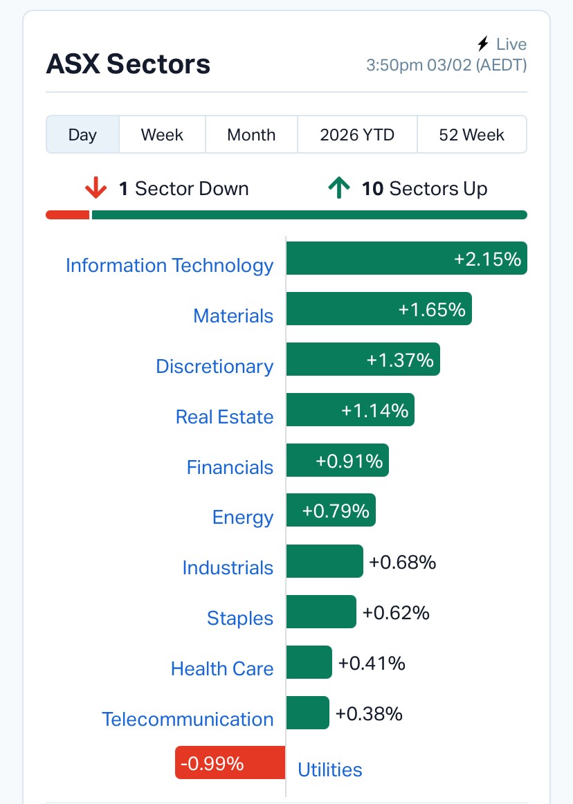 Spot gold rose 3.25% to US$4,811/oz, while silver jumped 5.08%. That recovery filtered quickly into local miners, with the ASX Gold index up 2.38%.