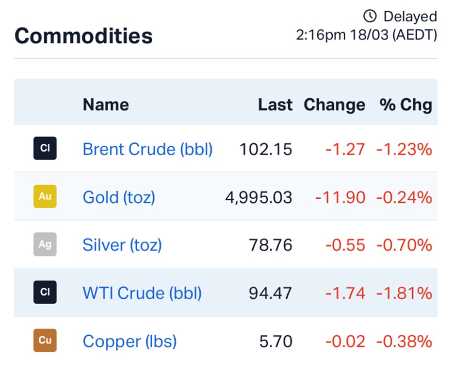 Energy stocks are climbing alongside Brent crude above $US102, while financials are slipping, with the banks index down 0.25%. Gold is easing, and rate-sensitive sectors remain fragile.