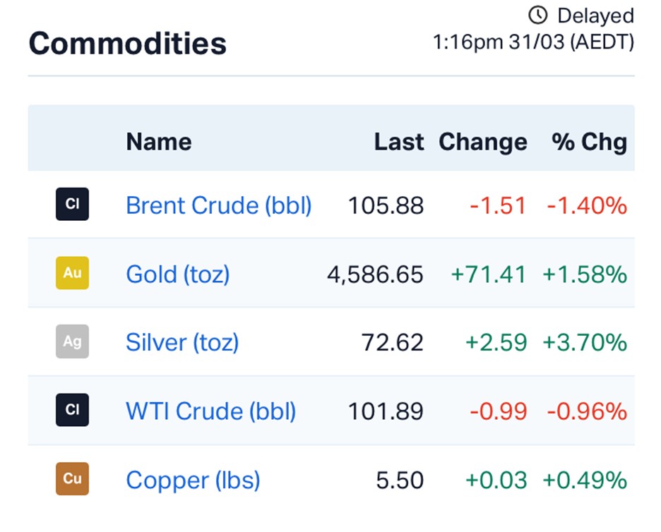 Brent crude remains elevated above $US106 a barrel, while gold continues to rally as a safe haven.