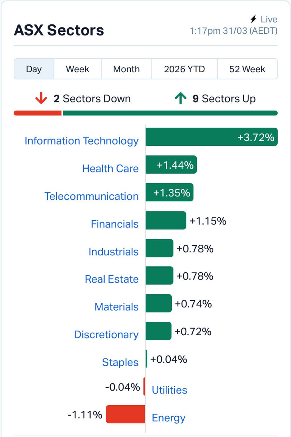 Financials, healthcare, and industrials are also in positive territory, suggesting broad-based buying rather than a narrow rally.