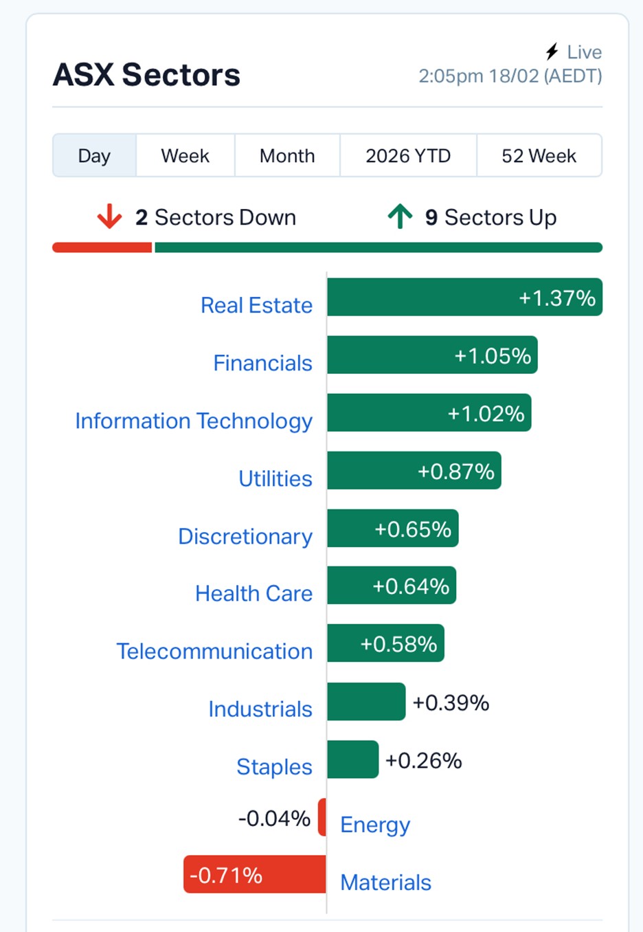 Sector performance revealed a market shifting toward earnings visibility rather than cyclical exposure. The All Technology Index and Real Estate sector were among the day’s strongest performers, supported by upbeat earnings from property giant Dexus, whose statutory profit surged sharply year-on-year, suggesting the commercial property cycle may be stabilising after a prolonged downturn.