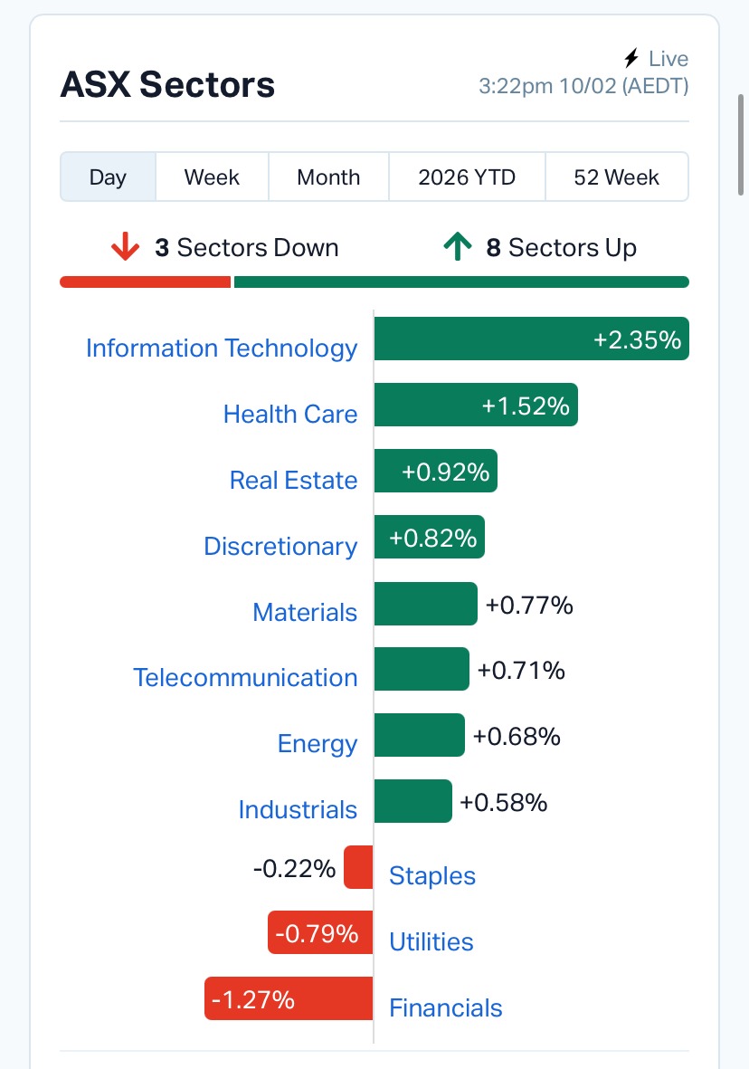Gold stocks also remained firm, with the ASX All Ordinaries Gold Index rising 1.01%, even as spot gold prices eased slightly to around US$5,023 per ounce, highlighting continued demand for defensive exposures amid global geopolitical uncertainty.