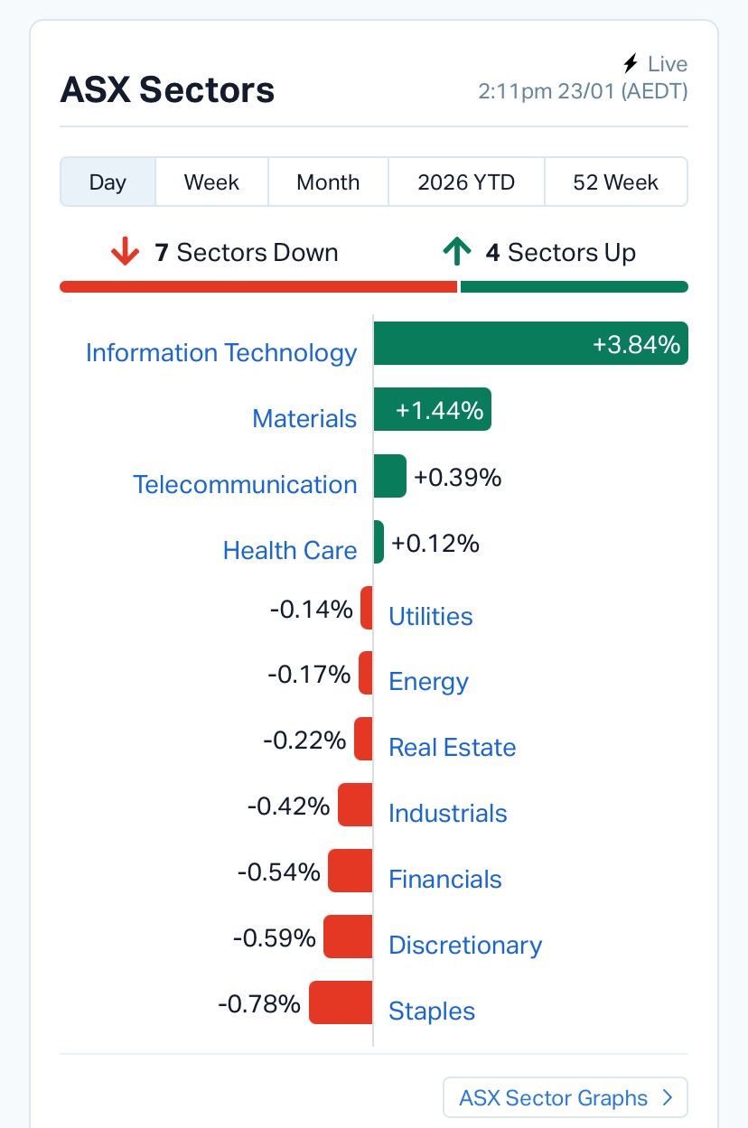 The market’s rally was not evenly shared. The ASX 200 Banks index slipped 0.32%, and Financials were down 0.31%. That matters because banks often dictate whether an ASX move has real breadth. Today’s gains were more concentrated in tech and select resources rather than a full market surge.