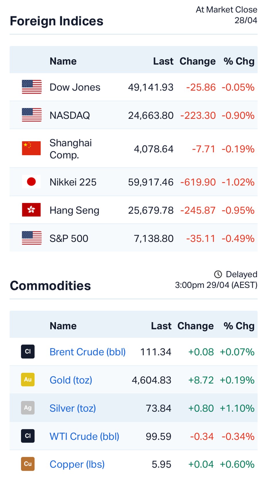 Overnight, Wall Street closed modestly lower, with the NASDAQ Composite falling 0.9% and the S&P 500 slipping 0.49%, reflecting growing unease around persistent inflation and higher-for-longer interest rates.