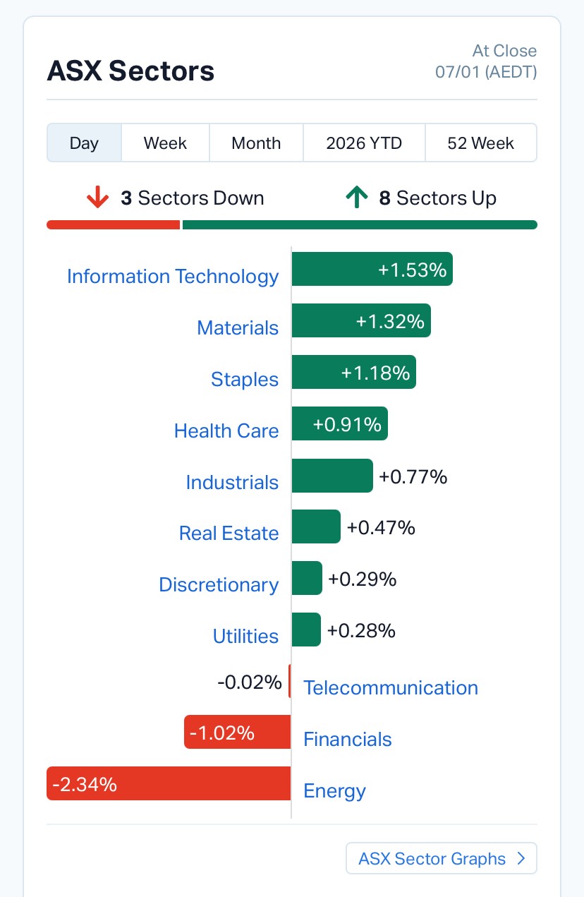 Eight of the ASX’s eleven sectors finished higher, led by Information Technology, which rose 1.53 percent. The rebound followed a choppy start to the year for tech stocks, with sentiment improving as global bond yields stabilised and earnings expectations remained intact.