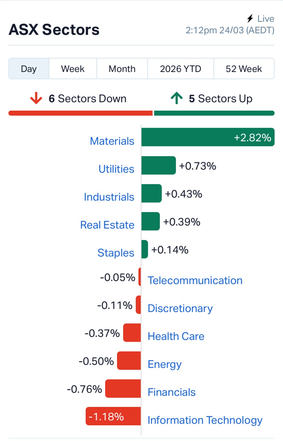 Materials led the charge, up 2.83%, with the ASX 200 Resources index gaining 2.29%. Gold stocks also staged a recovery, with the All Ordinaries Gold index rising 2.84% after recent heavy selling.