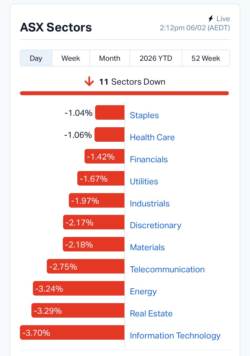 At midday trade, the S&P/ASX 200 slipped about 1.7% to 8,738.9, while the All Ordinaries fell 1.9%. The All Technology Index dropped nearly 4.9%, highlighting the persistent pressure on growth and software names. Eleven of the eleven major sectors traded lower, underscoring the defensive tone across the market.