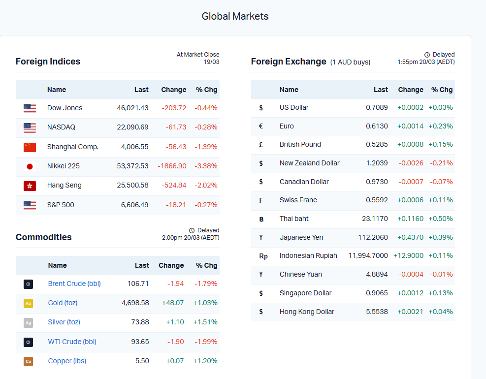 Source:ASX Market Data, March 20, 2026; Global market data; AMP, NAB, RBC commentary