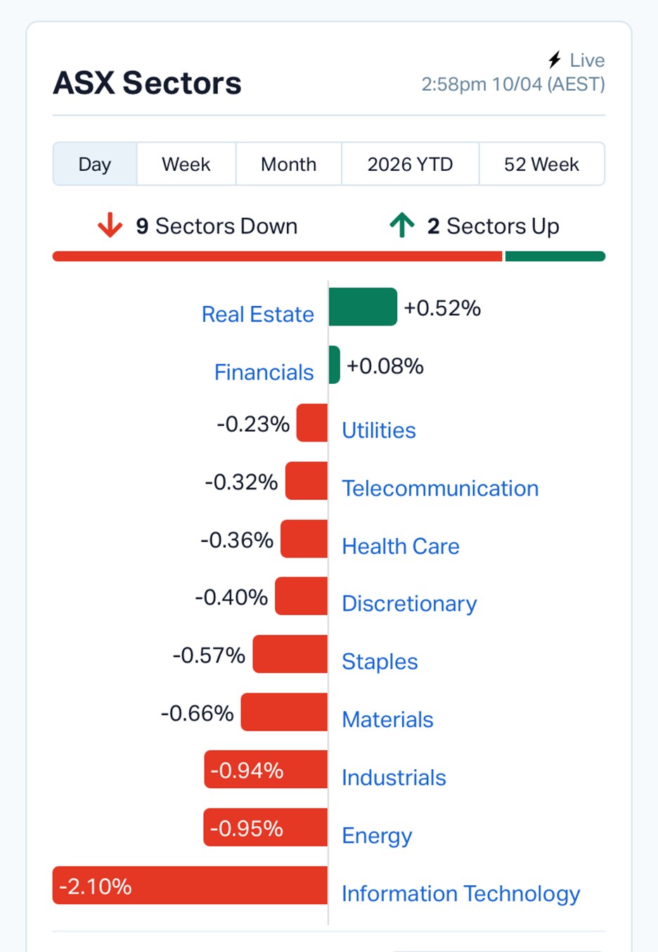 On the downside, Beetaloo Energy fell sharply by almost 16%, leading the losers. Orora dropped 7.4% following ongoing concerns around supply chain disruptions linked to the Middle East.