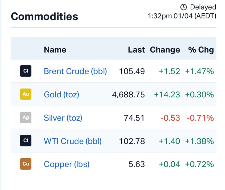 Meanwhile, Brent crude is hovering around $US105 per barrel, still elevated but no longer accelerating.
