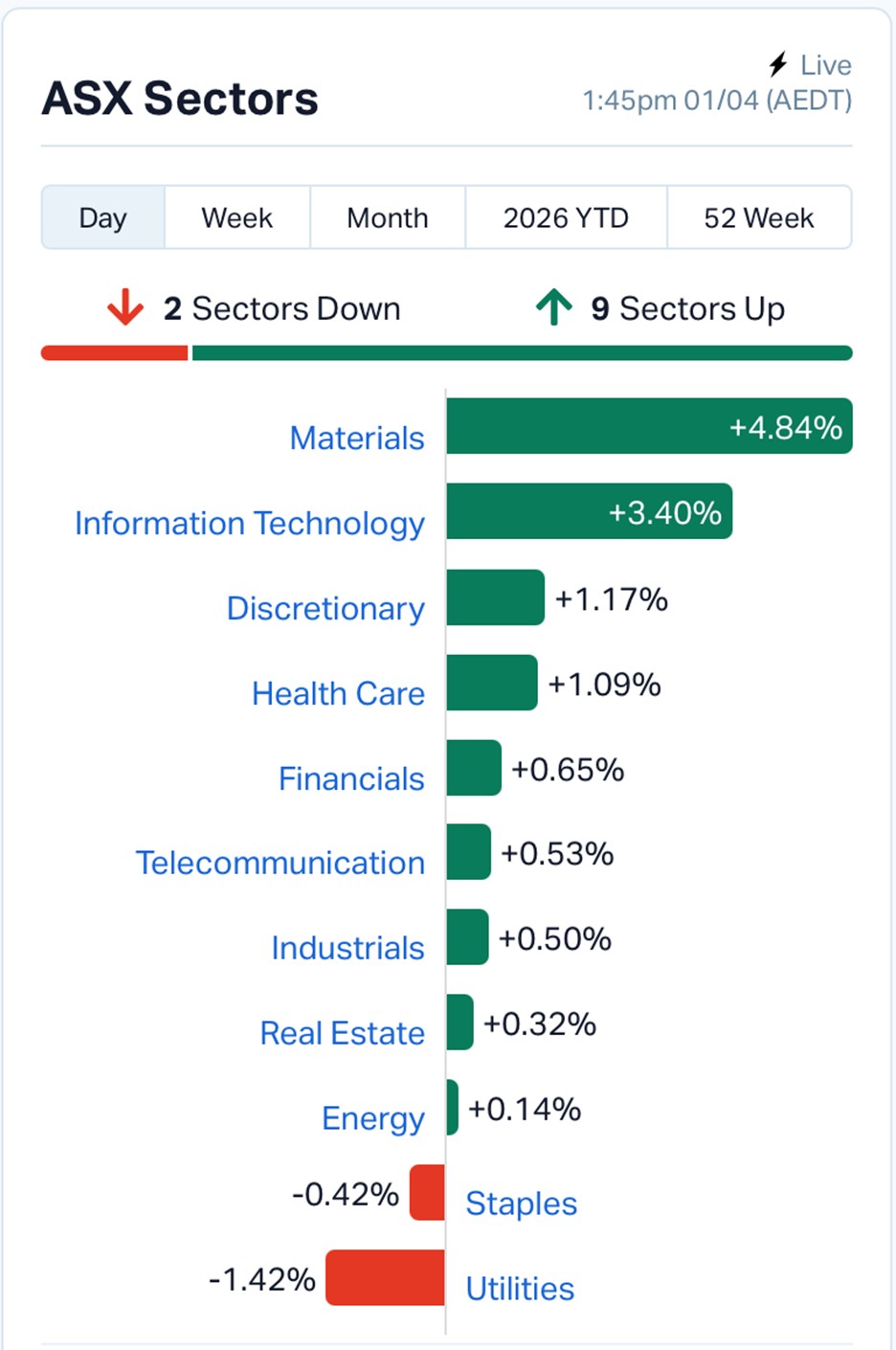 The materials sector surged 4.91%, making it the standout performer on the day. Resource-heavy indices also reflected the strength, with the ASX 200 Resources index climbing more than 4%.