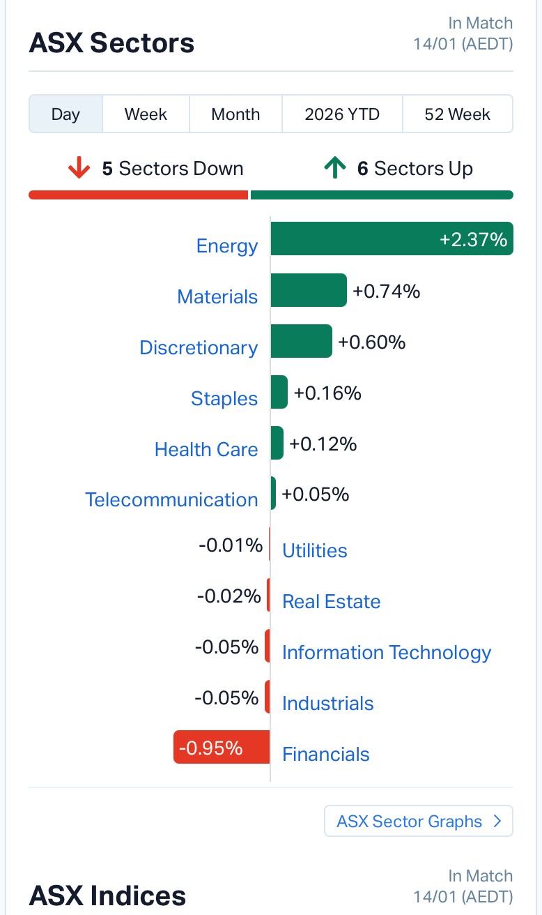 At the same time, geopolitical tension in the Middle East kept energy traders on alert, with commentary suggesting Iran-related developments had oil markets betting on the risk of broader disruption. While Brent crude was only modestly lower in the afternoon snapshot at around US$65 a barrel, the broader narrative helped keep energy pricing sensitive to headlines, and it may also have supported risk appetite in energy equities even as other sectors cooled.