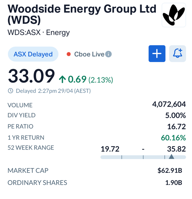 Woodside shares rose 2.18% to $33.10 in afternoon trade, extending a strong run that has seen the stock gain over 60% in the past year.