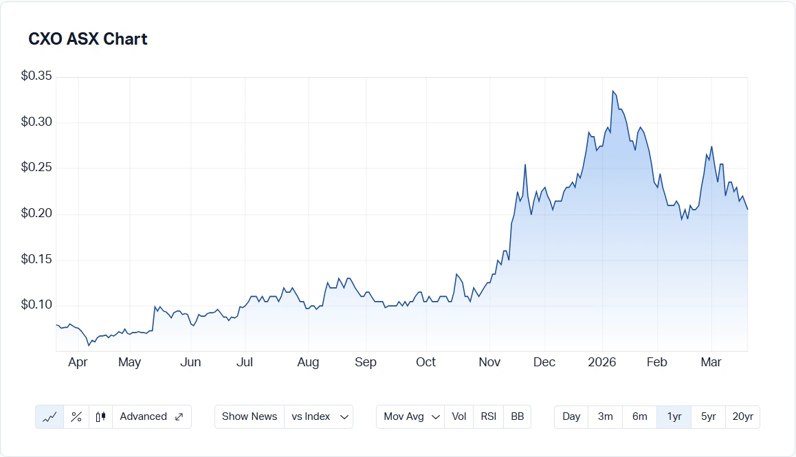CXO 1-Year Stock Price Chart | Source: MarketIndex
