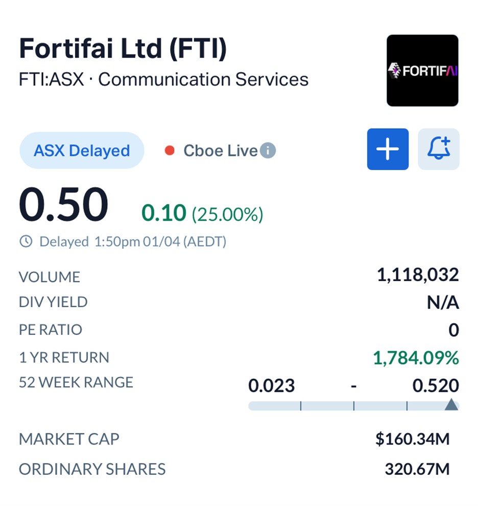 Shares in FortifAI rose 25% to $0.50 by early afternoon trade, extending a remarkable 12-month gain of more than 1,700%.