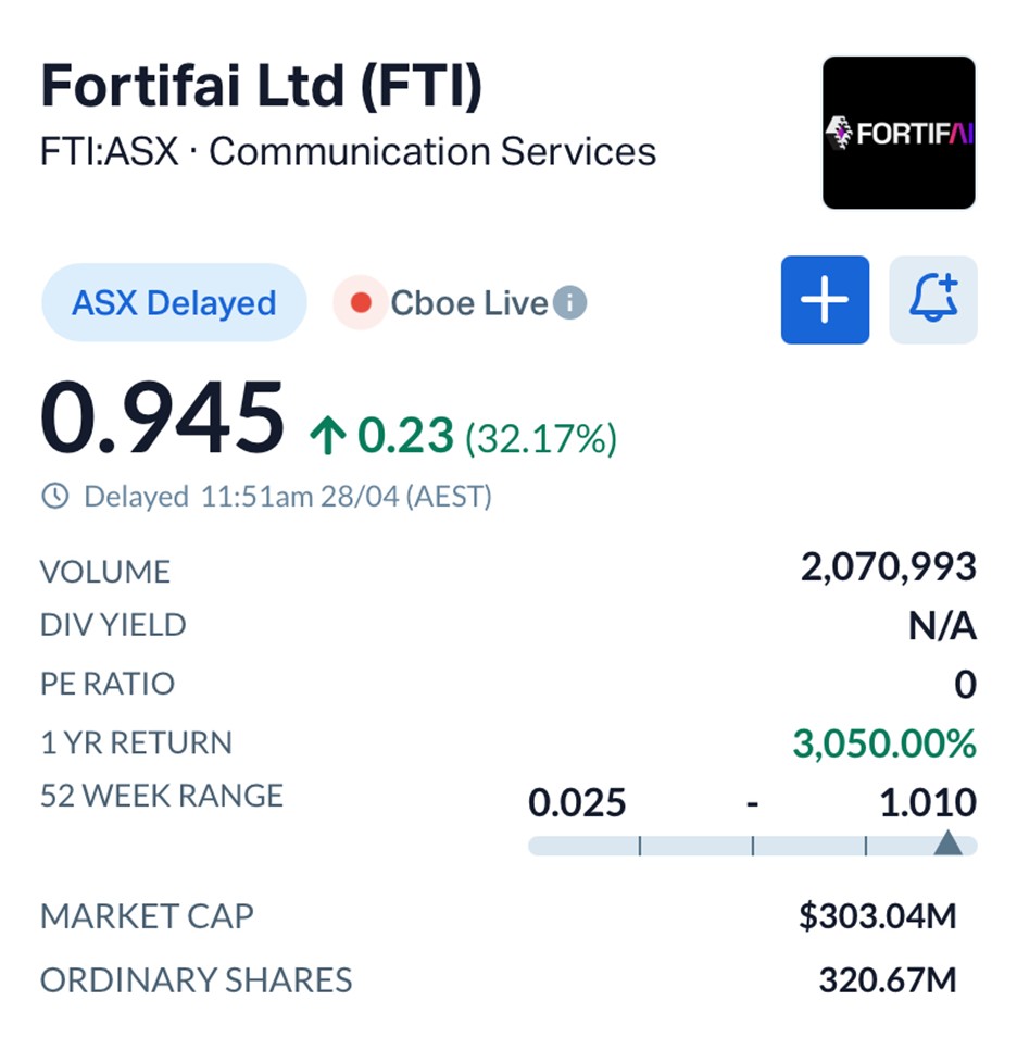 FortifAI shares surged 32.17% to $0.945, with trading volumes exceeding 2 million shares by late morning.