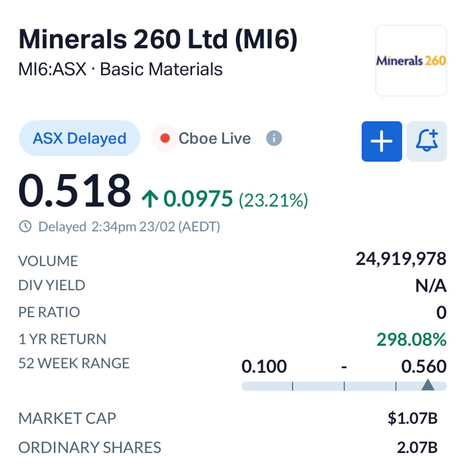 Minerals 260 Ltd (ASX: MI6) share price movement (23 Feb 2026)