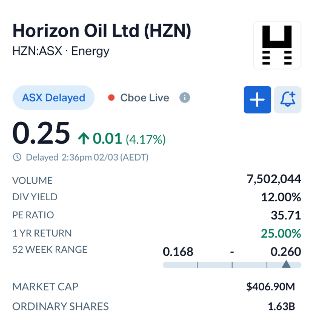 Horizon shares rose 4.17 percent to $0.25 in afternoon trade, with volumes exceeding 7.4 million shares. The company now carries a market capitalisation of around $407 million and a dividend yield near 12 percent.