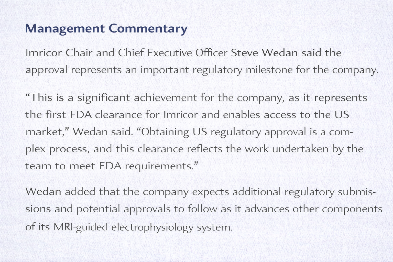 Imricor Chair and Chief Executive Officer Steve Wedan said the approval represents an important regulatory milestone for the company.