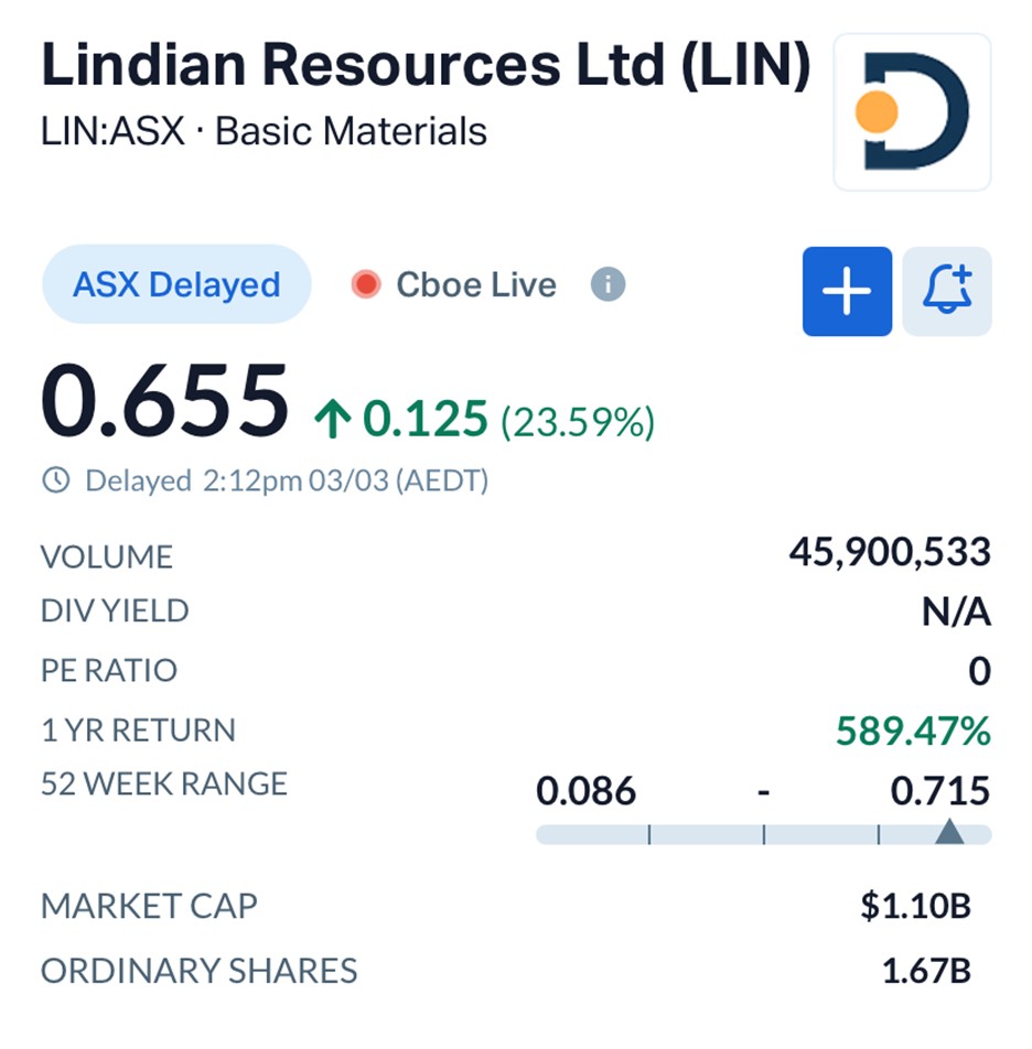 Lindian was trading at $0.655, up 23.59%, with more than 44 million shares changing hands. The stock is now up nearly 590% over the past year, lifting its market capitalisation to about $1.1 billion.