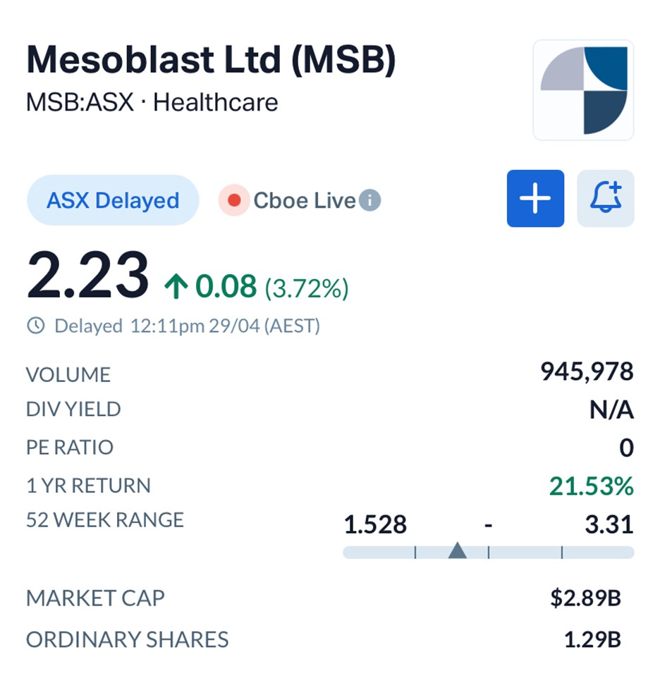 Shares in Mesoblast rose 3.72% to $2.23 by midday, reflecting a measured but positive response from the market.