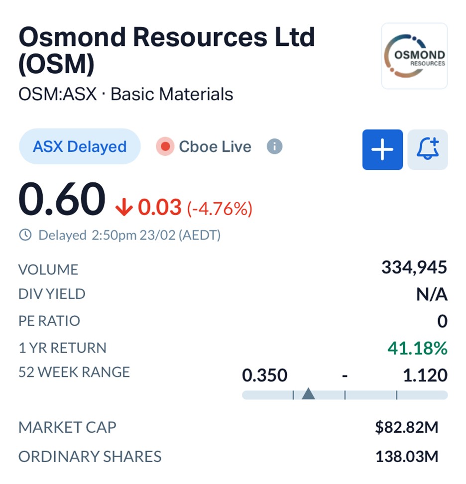 Despite the strategic nature of the deal, Osmond shares were trading down 4.76 percent to 60 cents in afternoon trade on Monday, with a market capitalisation of approximately $82.8 million. That pullback reflects the broader volatility in small cap resource stocks rather than a clear rejection of the strategy.