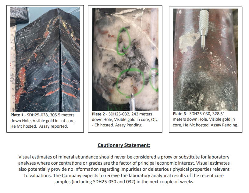 Five diamond holes across a 225 metre strike have all intersected visible gold within a continuous hematite magnetite unit, suggesting the system is coherent rather than isolated pockets.
