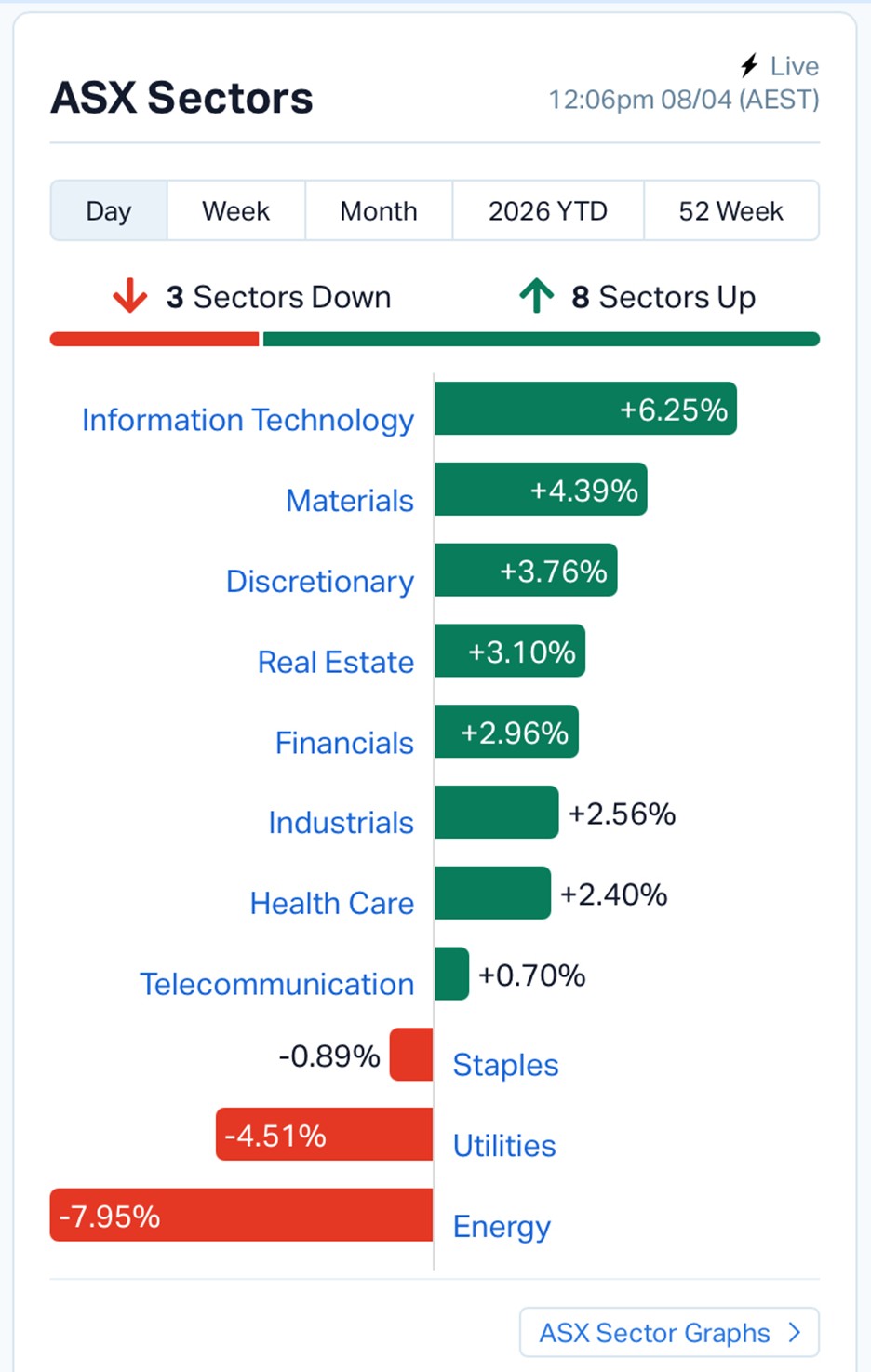 The ASX 200 surged more than 2.4% to around 8,942 points by late morning trade, while the broader All Ordinaries Index climbed over 2.5%. Technology stocks led the charge, with the S&P/ASX All Technology Index jumping nearly 5%.