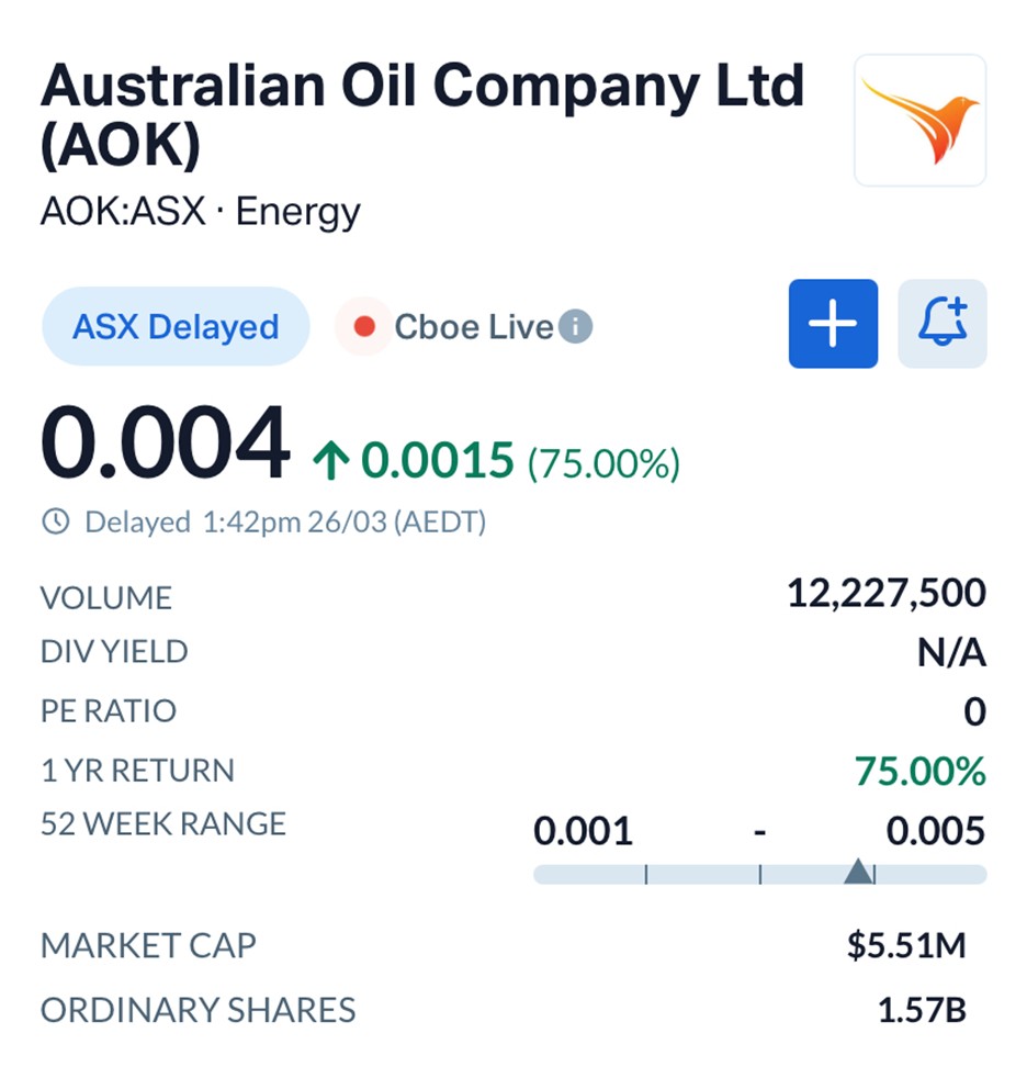Shares in Australian Oil Co surged 75% to $0.004, with trading volumes exceeding 12 million shares.