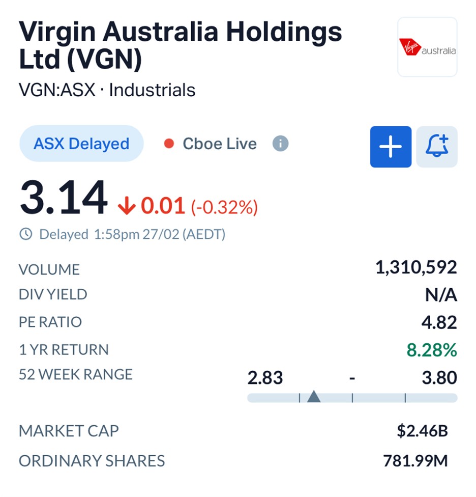 Shares in Virgin were trading at $3.14 in early afternoon trading, down slightly on the day but still reflecting a stable recovery story following the airline’s post pandemic restructuring.