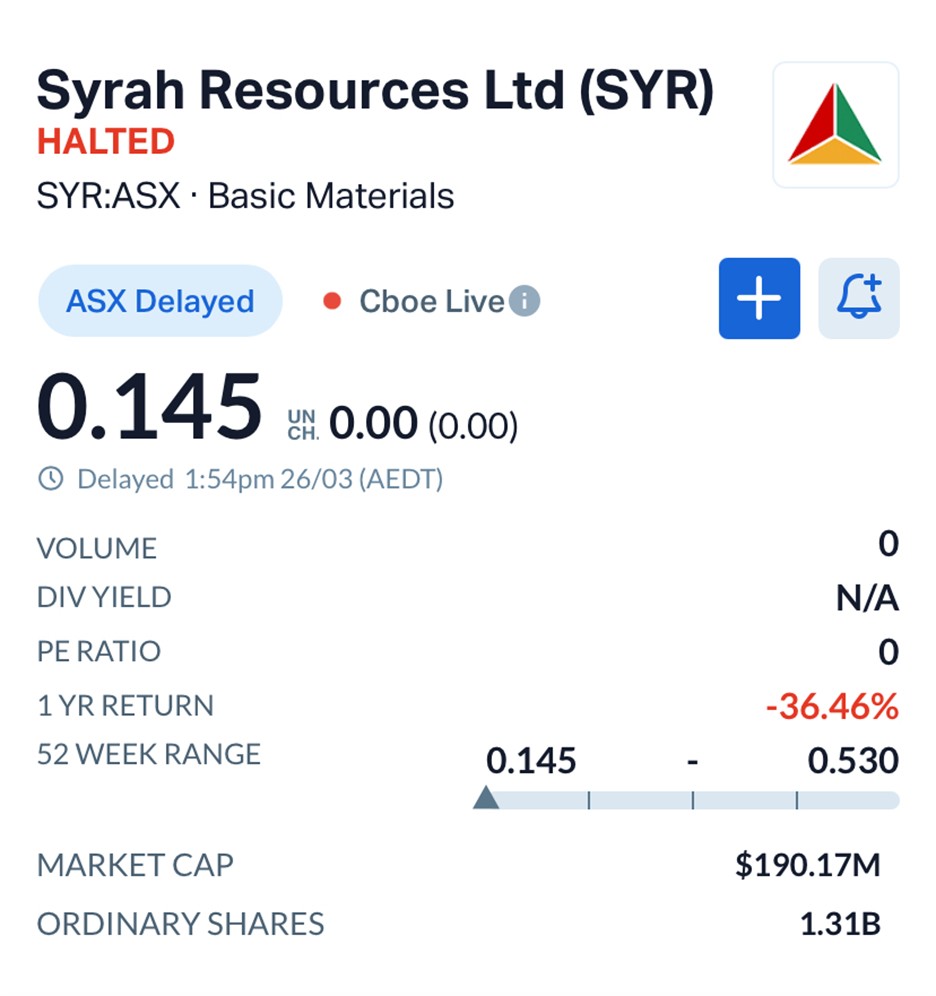 Syrah shares remain in a trading halt at $0.145, as the company works through a complex package involving equity raising, debt restructuring, and strategic government backing.