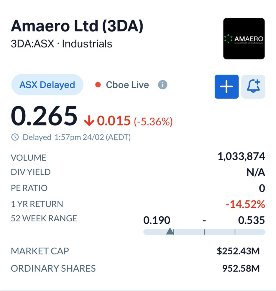 Amaero International has confirmed plans to shift its legal headquarters from Australia to Delaware in the United States, while remaining listed on the ASX under the ticker 3DA. The announcement has sparked debate well beyond the share price, which fell 7.1 percent to 26 cents on Tuesday afternoon.